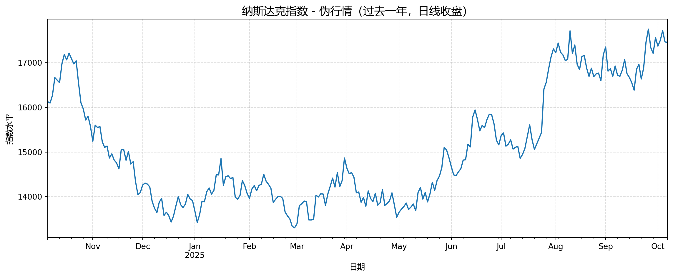 # 纳斯达克指数伪行情(过去一年日线) import numpy as np import pandas as pd import matplotlib.pyplot as plt # 为可重复性设置随机种子 np.random.seed(42)