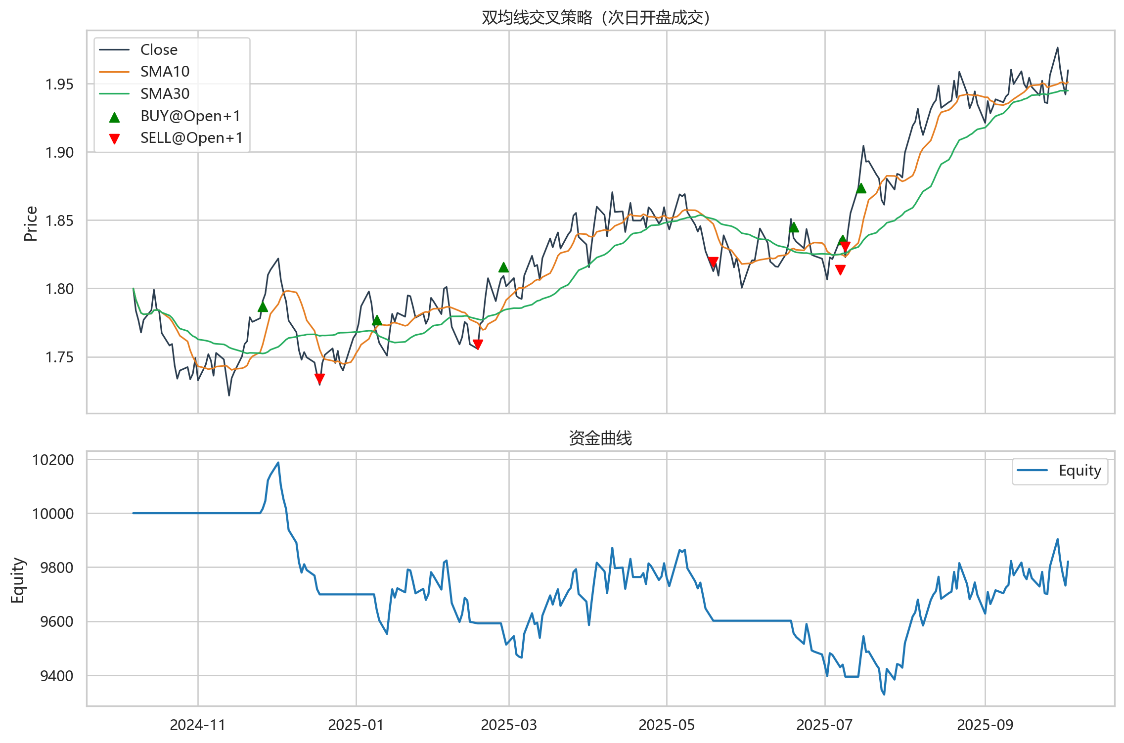 # 完成自己的第一个策略:双均线 # 1) 使用 trade_utils.get_nasdaq() 获取“纳指相关ETF”伪数据(价格约1.8,工作日) # 2) 实现双均线交叉策略(SMA 短期/长期) # 3) 初始资金 10000 元,手续费 万0.5(0.05%),买卖以 100 的整数倍 # 4) 输出关键指标:夏普、年化收益、最大回撤…